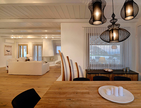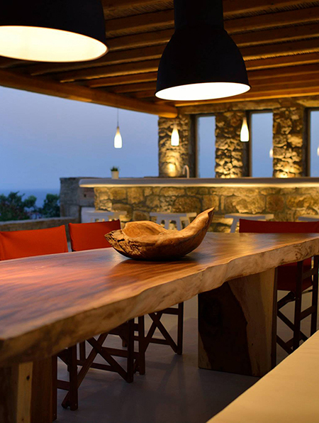 The house is surrounded by a beautifully landscaped garden of 1.200 sq.m. and very large terraces of 200 sq.m., which are shaded by wooden pergolas and consists of a living room for 8 people, two separate dining areas of 6 and 10 people each, as well as a full-equipped bar and barbeque.